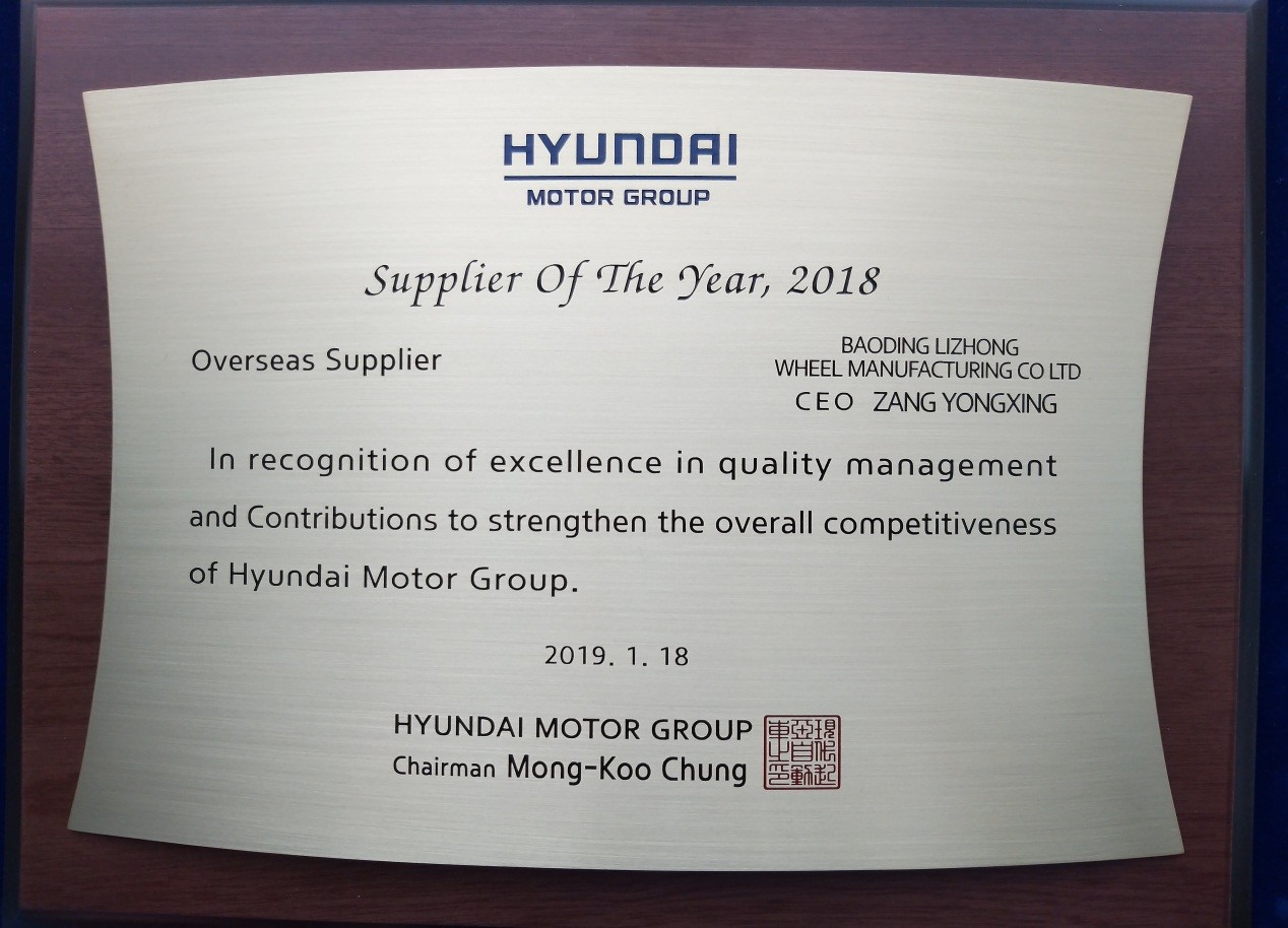 2019年1月,现代起亚汽车集团授予保定市J9九游会车轮制造有限公司“优秀供应商”奖项并颁发证书。集团总裁张建良先生作为集团代表出席了大会并接受颁奖。 此奖项是现代起亚汽车集团对供应商开发能力、交付能力及品质保证的全面认可,意义非凡。